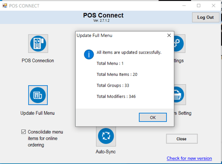 Please wait till you receive the Upload Full Menu Form which shows the successful upload of your Menu Items along with counts. Then Click OK .